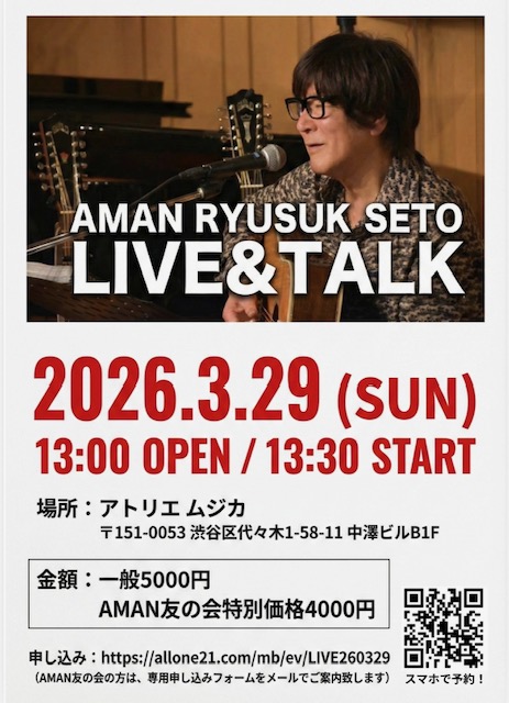 ☆2026年3月29日(日)「AMAN RYUSUKE SETO LIVE&TALK」のお知らせ。
